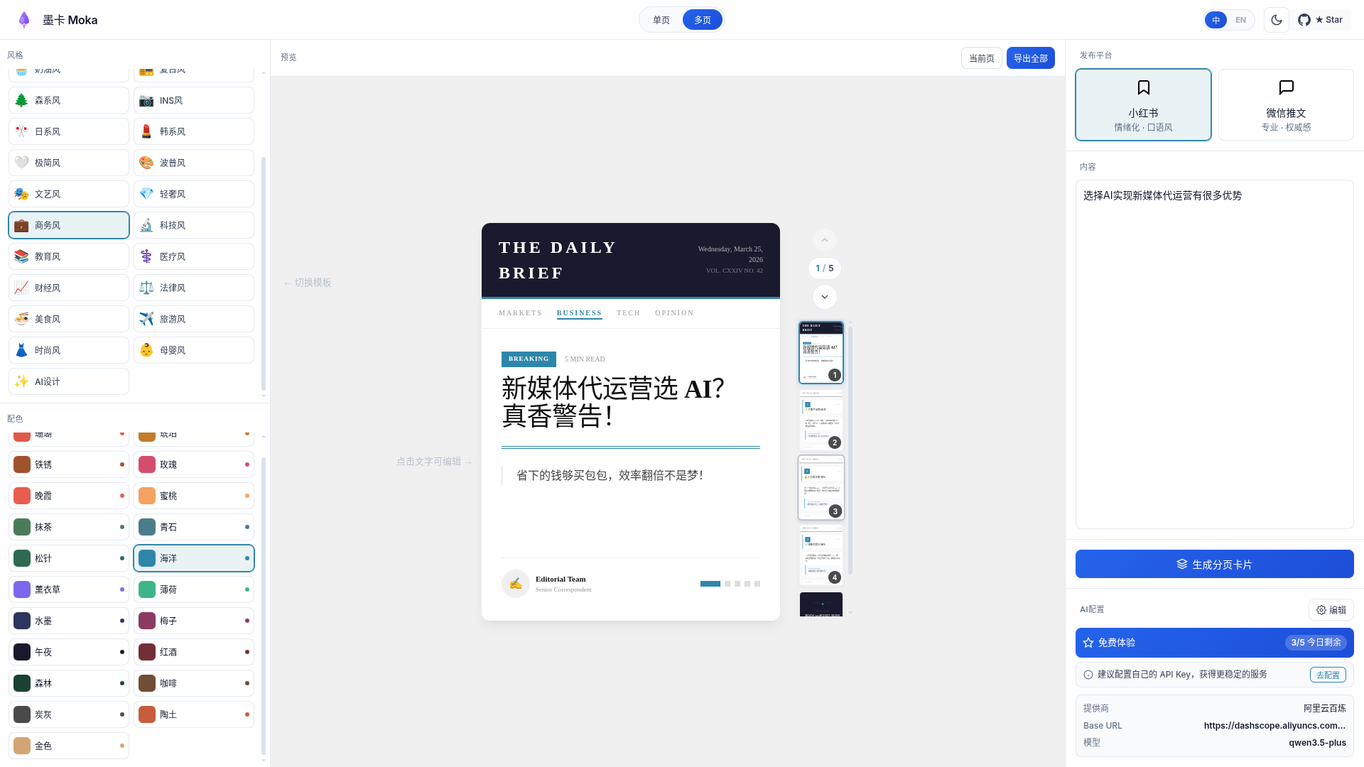 墨卡 Moka 的操作界面直观友好,主要分为控制面板(左侧区域)和预览编辑区(右侧区域)。以下是具体的实战操作指南,帮助你快速完成从文本到视觉海报的跨越: