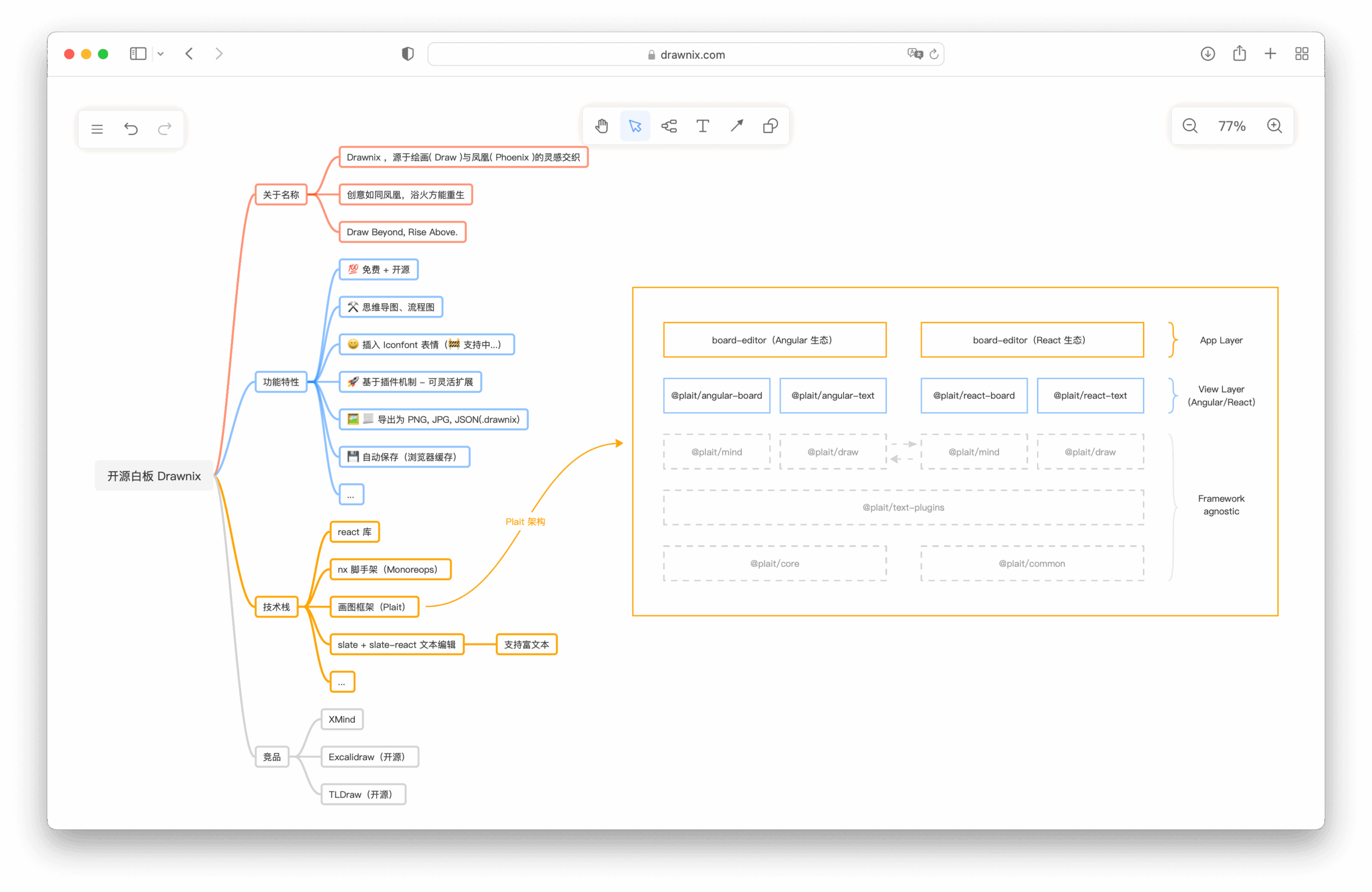 - Plug-in Architecture: The underlying is based on the Plait framework, which supports the integration of a variety of UI frameworks (e.g. Angular, React) and rich-text frameworks.