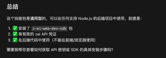 z-ai-web-dev-sdk Z.aiの存在は、Z.aiが次のようなものを提供していることを意味する。設定済みのクラウド仮想環境(クラウド開発環境).これらのスキルは、高度に並行したトークン計算、メディアレンダリング、ネットワーク要求をサーバー側で直接処理するため、Smart Spectrumの内部クラウド機能(サーバーレス・ランタイム)に大きく依存している。