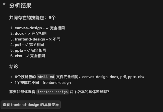 ディレクトリ: /skills、その中のスキルパック、ディレクトリ.claude/skillsと同じスキルがいくつあるか、その中のskills.mdがまったく同じかどうかを分析するのを手伝ってください。