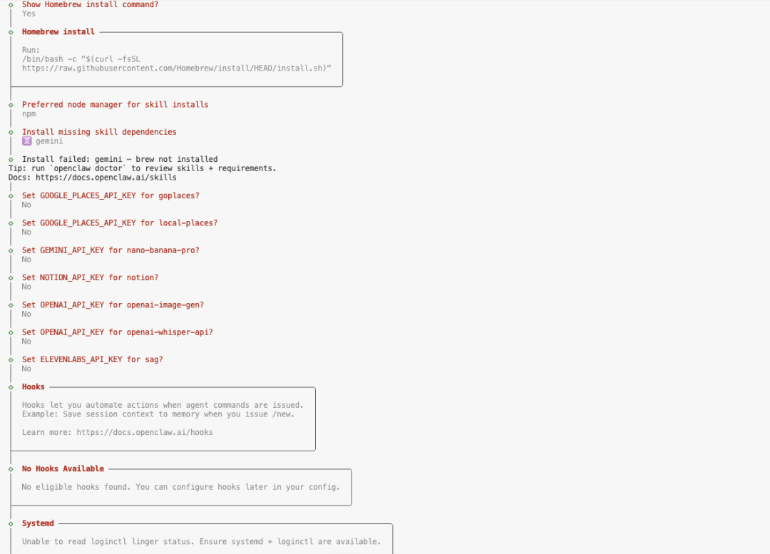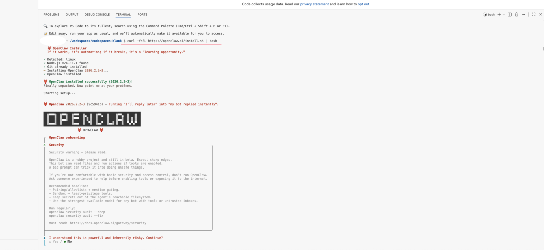 安装脚本执行完毕后,会自动进入 Onboarding(初始化向导) 流程。