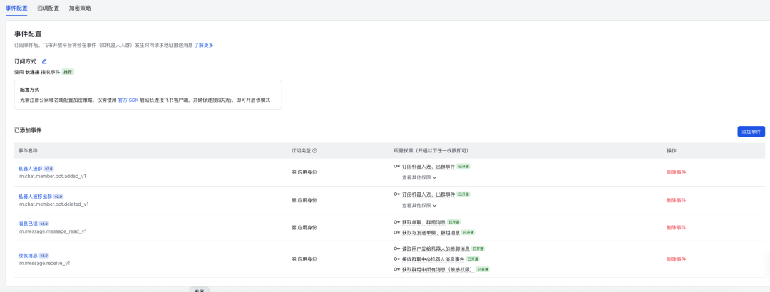 im.message.receive_v1(接收消息 v1版)im.message.message_read_v1(消息已读通知)im.chat.member.bot.added_v1(机器人进群通知)im.chat.member.bot.deleted_v1(机器人被移出群通知)
