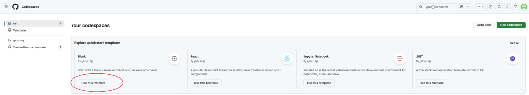 访问GitHub Codespaces主页,点击左侧导航栏的 “New codespace” 或选择 “Blank” 模板,初始化一个纯净的Linux环境。