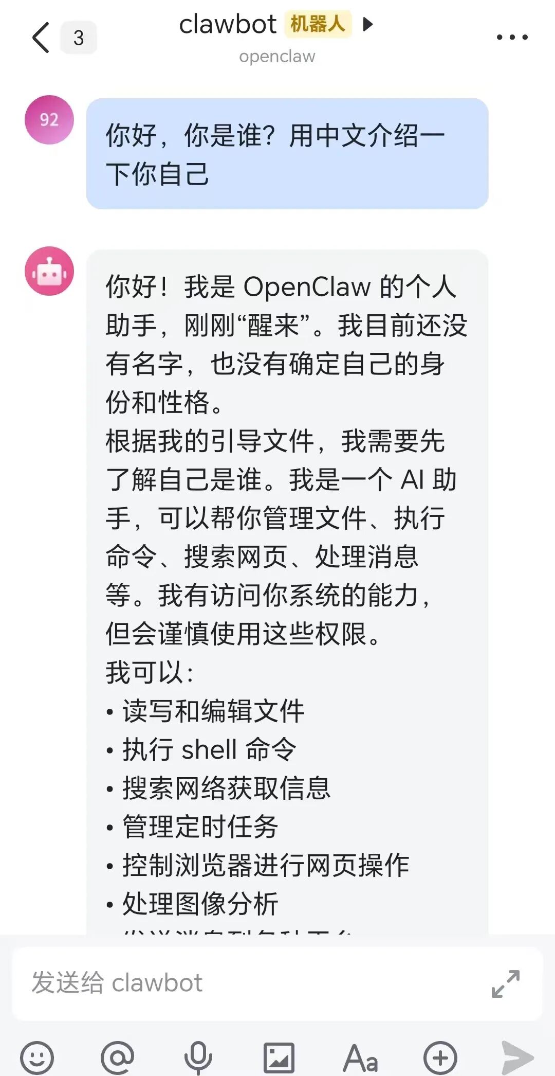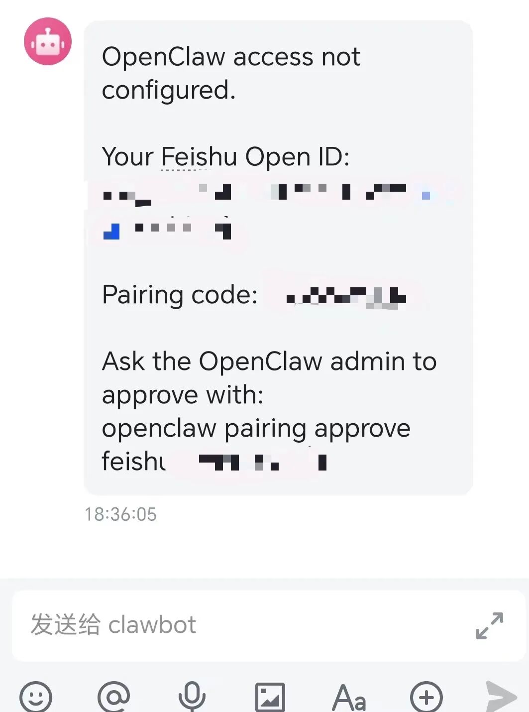 此时机器人不会回复内容,而是会收到一条系统提示(或在日志中显示),告知当前处于 Pairing Mode,并给出一个配对验证码。