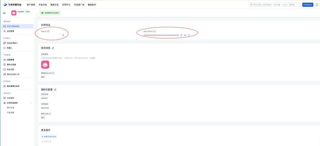 OpenClaw最新版已内置飞书适配器,无需安装第三方插件。接下来的关键在于飞书开放平台的配置。