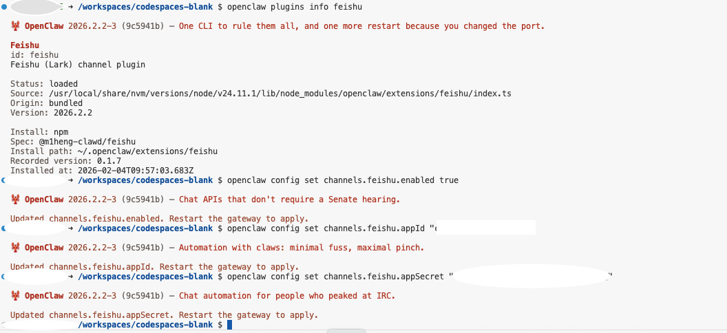 回到Codespaces终端,配置OpenClaw的飞书通道参数: