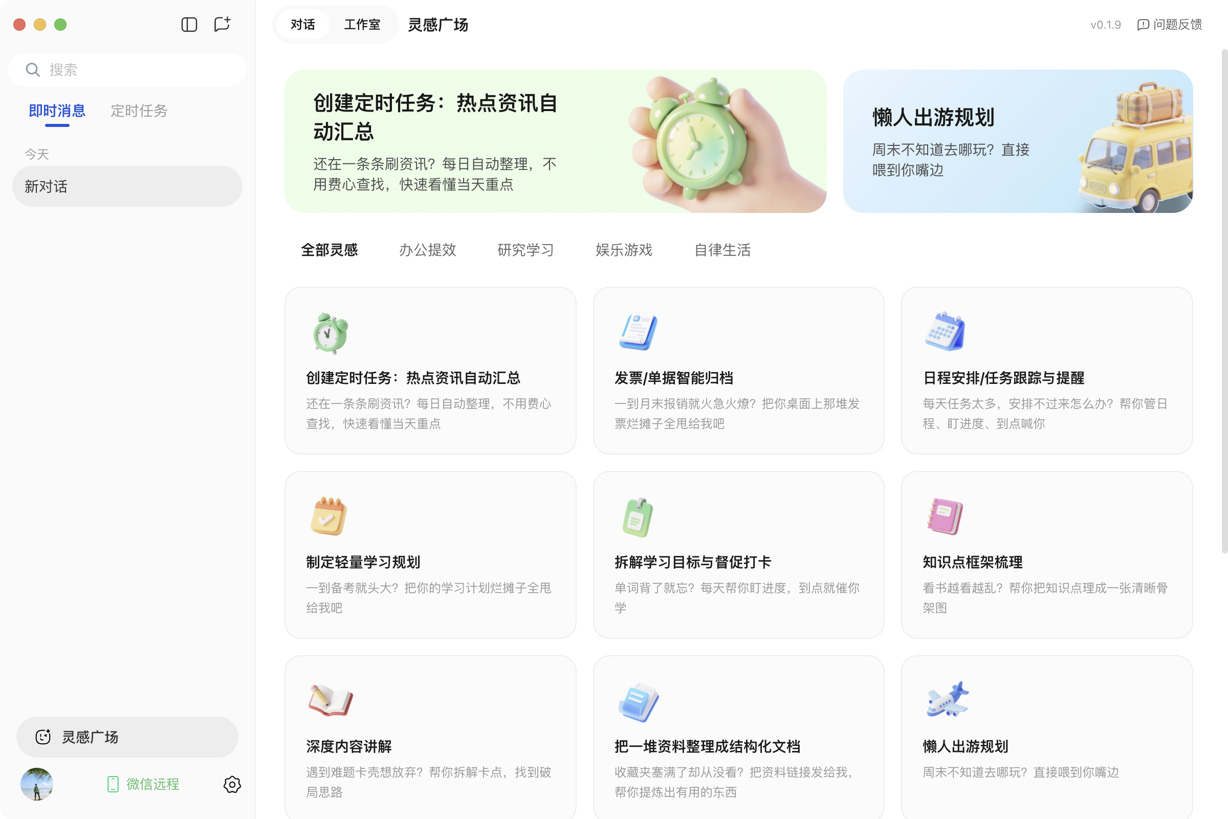 - 寻找使用灵感:在电脑端软件界面或微信小程序菜单栏中点击进入「灵感广场」。你会看到系统已经为你梳理好了四大核心应用场景:“办公提效”、“深度研究”、“娱乐游戏”以及“自律生活”。